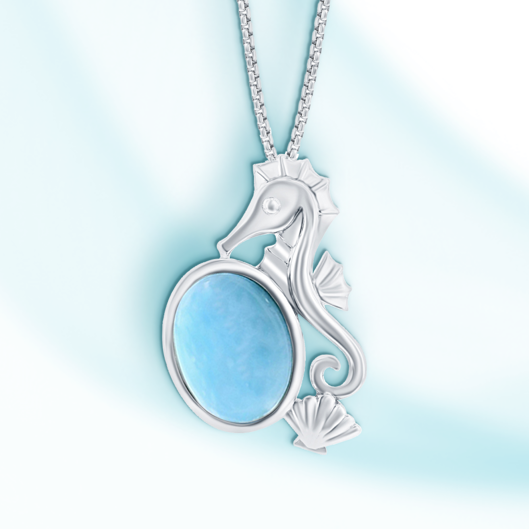 Embrace the enchantment of oceanic wonders with our Caribbean Embrace Seahorse Pendant. This exquisite piece captures the gentle grace of the seahorse, paired with the timeless elegance of a shell, both exquisitely crafted in sterling silver. At the heart of the pendant lies a vibrant Larimar stone, sourced from the exclusive shores of the Dominican Republic, its hues echoing the clear Caribbean seas.