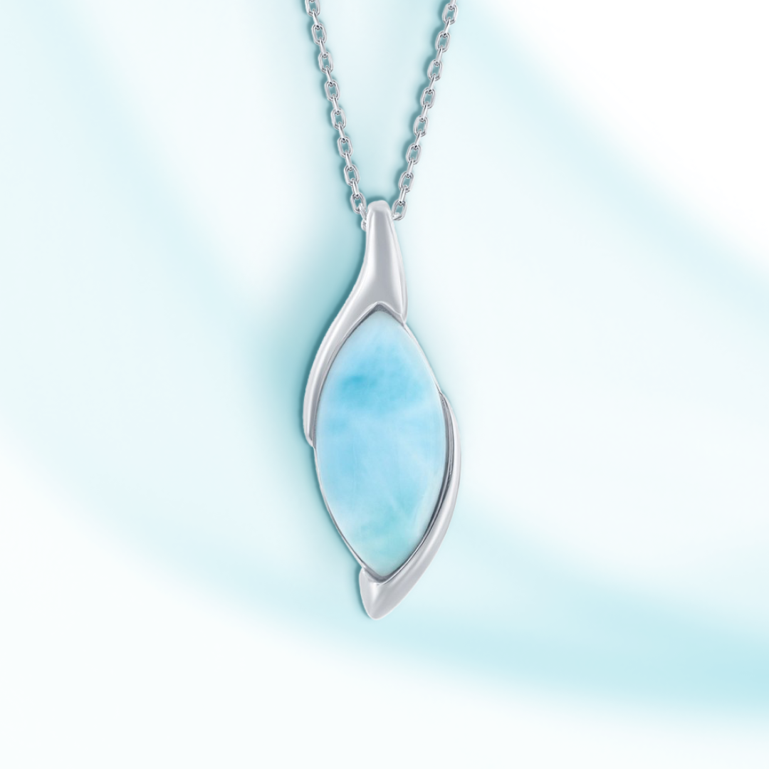 Each pendant, featuring Larimar sourced exclusively from the Dominican Republic, carries within it the essence of Caribbean tranquility.
