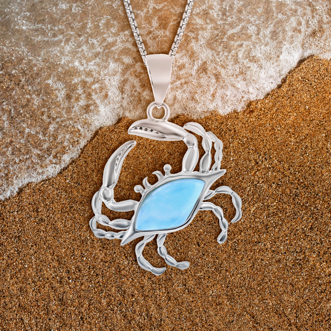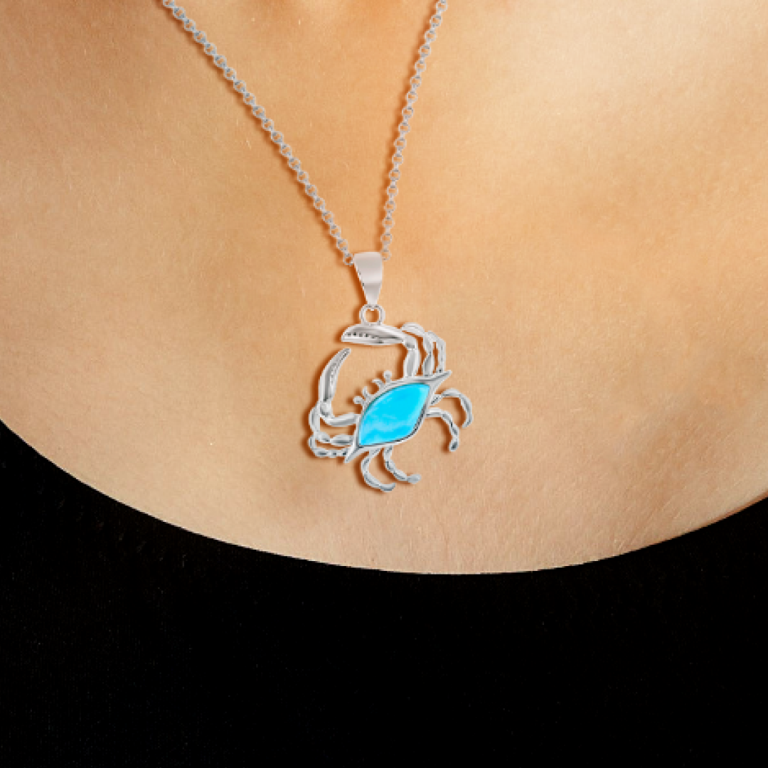 This delightful piece showcases a playful crab design, its legs and claws meticulously crafted in gleaming sterling silver, while its body is a vibrant Larimar stone.