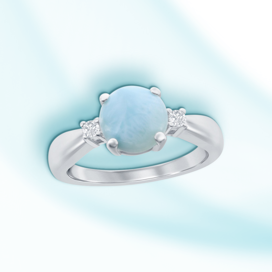 Adorn your hand with our Ocean's Crown Larimar Ring. A stunning round Larimar stone takes center stage, held securely by four prongs and flanked by sparkling white CZ side stones. The design creates a perfect balance between the serene blue of Caribbean waters and brilliant white sparkle.