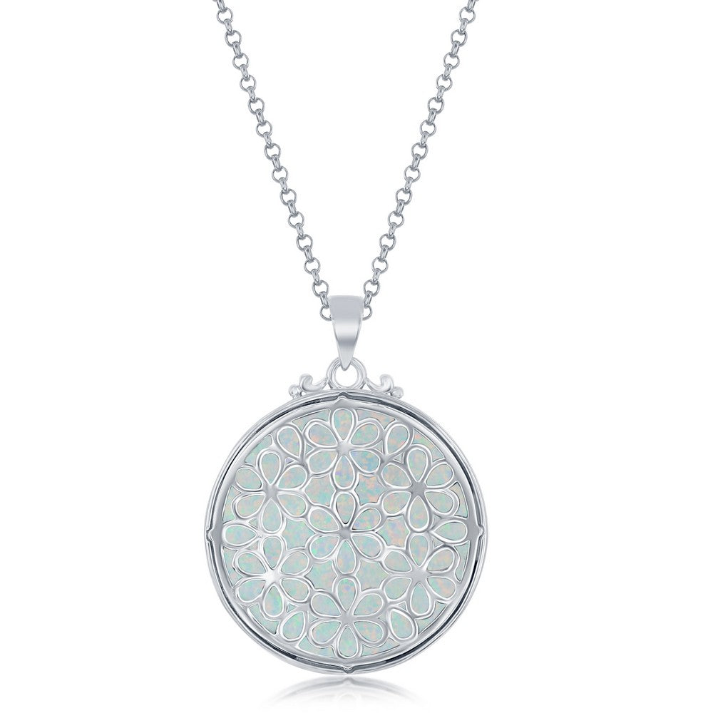 Sterling Silver Filigree Design Round Pendant w/Chain - White Opal