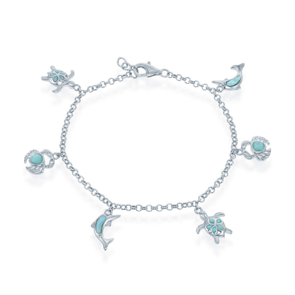 Sterling Silver, Larimar Turtle, Crab and Dolphin Charms Bracelet
