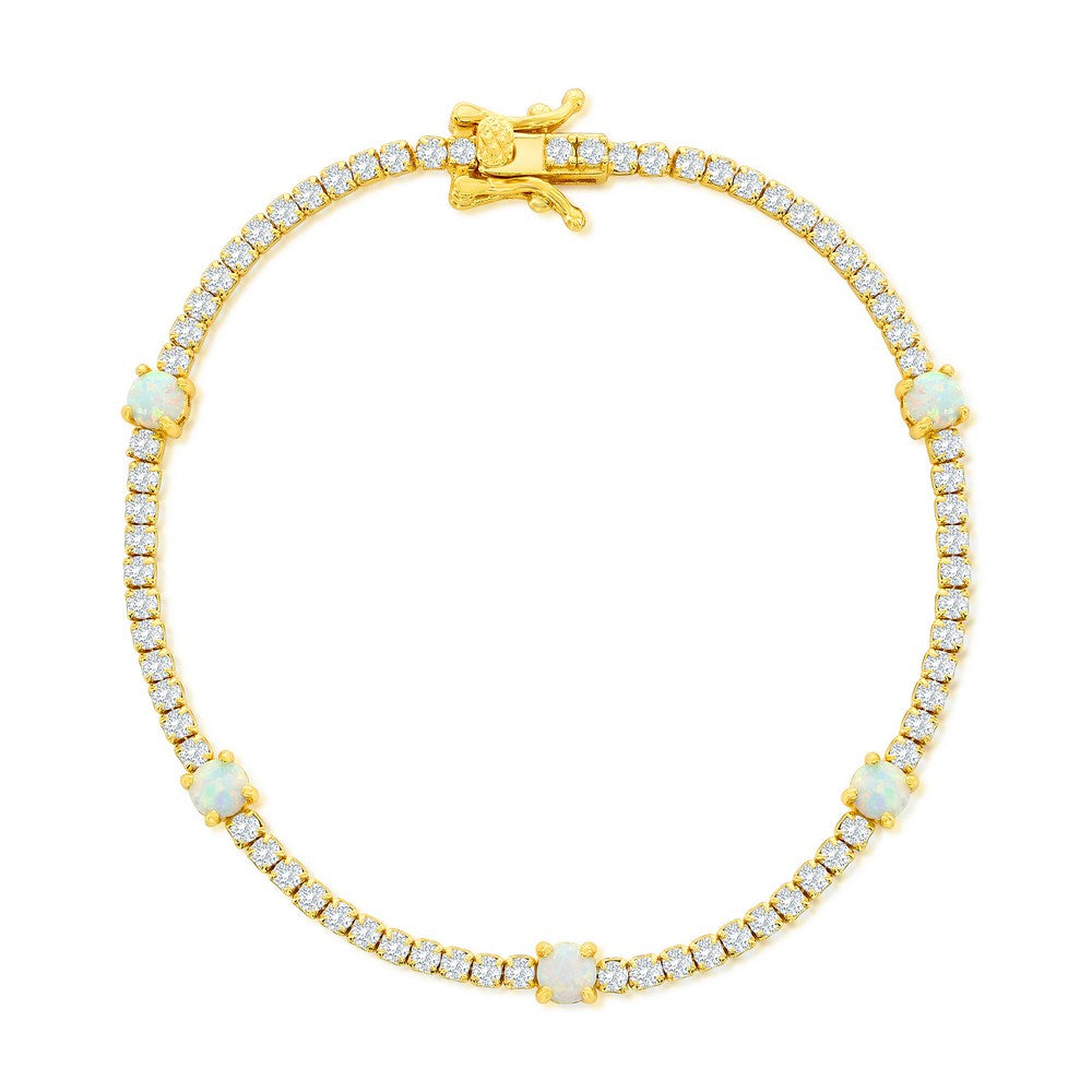 Sterling Silver, Round White Opal & CZ Tennis Bracelet - Gold Plated