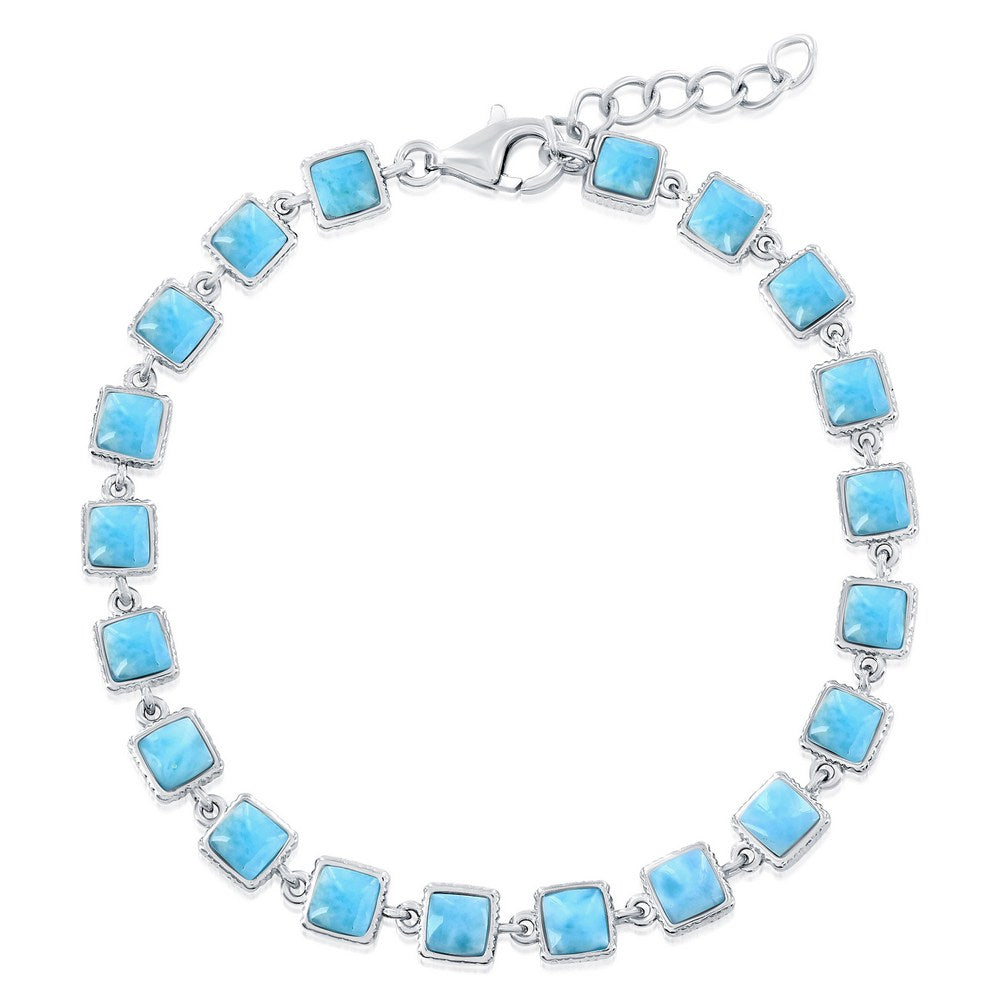 This sterling silver bracelet features nineteen bezel-set square larimar stones, each measuring 4.5x4.5mm, connected in a graceful linked pattern. Larimar's distinctive tranquil blue tones evoke the essence of tropical waters, making it an ideal accessory for refined tastes. The adjustable 7 to 8-inch length ensures versatile styling, whether worn as a daily statement or reserved for elevated occasions. An enduring treasure inspired by Caribbean beauty.