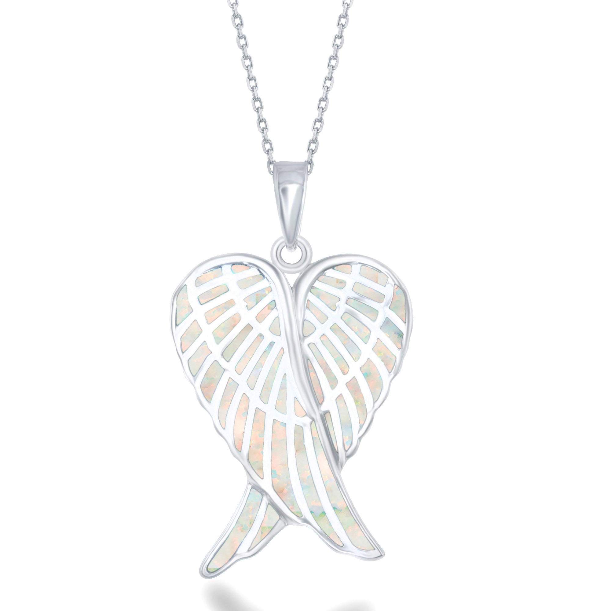 This meaningful sterling silver necklace features graceful angel wings adorned with luminous white inlay opal, symbolizing protection and spiritual guidance. The opal inlay work demonstrates exceptional artistry, with the stone's subtle play of light enhancing the ethereal quality of the design. Suspended from an 18-inch cable chain, this piece offers both emotional resonance and refined aesthetic appeal, making it a treasured accessory for those seeking inspiration and connection.
